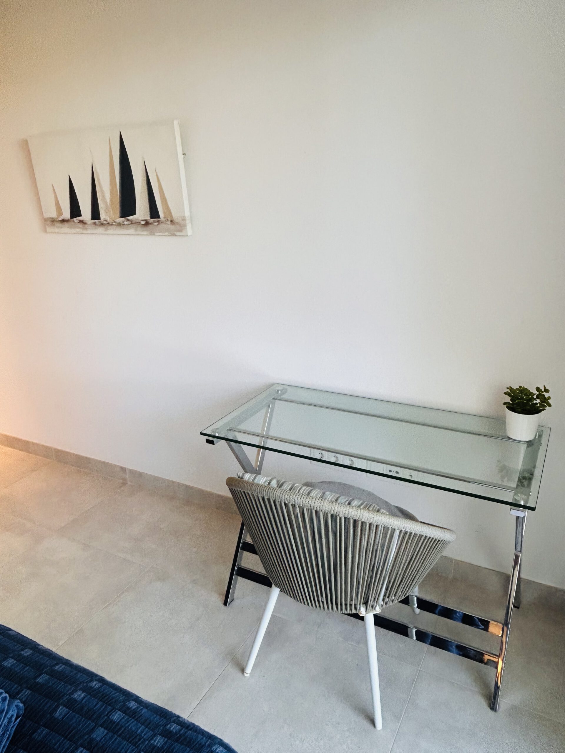 - Living & Dining: An open-concept layout with cool tiled floors, minimalist decor, and a dedicated glass-top workspace for "work-from-anywhere" ease.